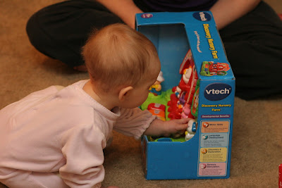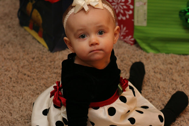 After church we headed to my in-laws' house for dinner and gifts. Ryan's family does what they call a "snack supper" every Christmas Eve. I honestly think it's Ryan's favorite tradition. It's basically just a dinner full of little appetizers and it is so good. After dinner it was time to open presents and we had a pretty good time doing that. Although Sarah was more interested in the bows than anything else.